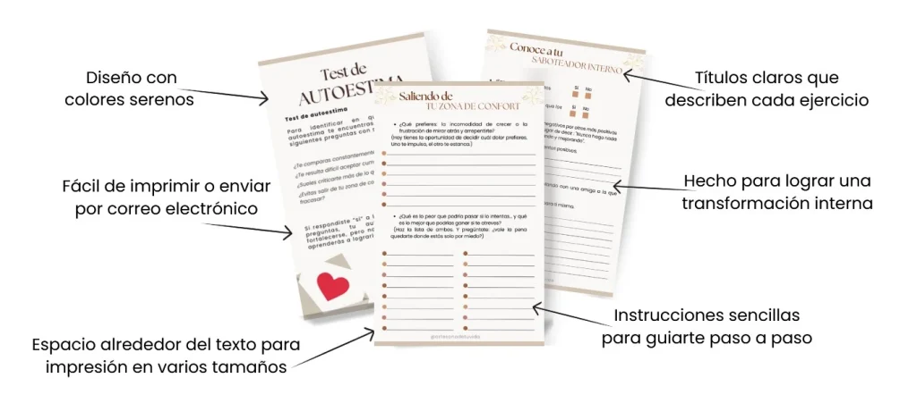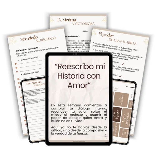 Ebooks, workbooks, mandalas, afirmaciones, diario y audios diseñados para reprogramar tu mente y tu diálogo interno.